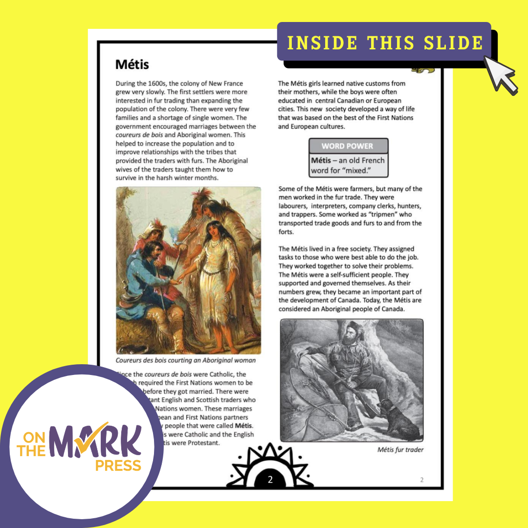 Description: Students will learn about the Metis, with the information and follow-up slides. The reading passages and question pages for each topic form a complete lesson that can be integrated into your existing history curriculum. The material allows for flexibility and can be used in whatever way best supports your curriculum needs. The link in the PDF directs you to the google slide lesson. You can edit the student worksheet to meet your students' needs! Includes both the google slides and a printable pdf for this lesson. There is also a link to the 48 Master the Facts Boom Card Game.